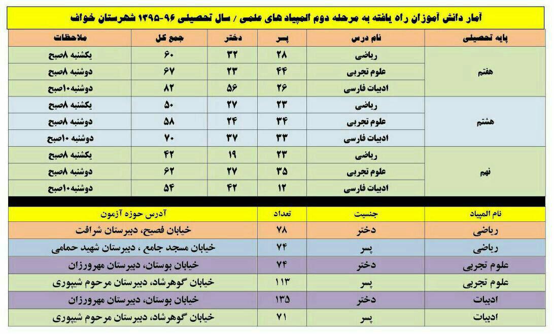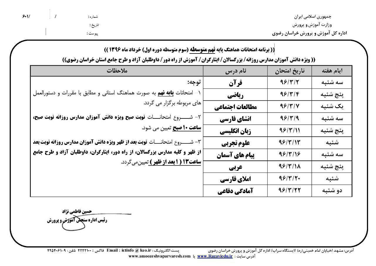 برنامه امتحانات هماهنگ استانی پایه نهم خراسان رضوی